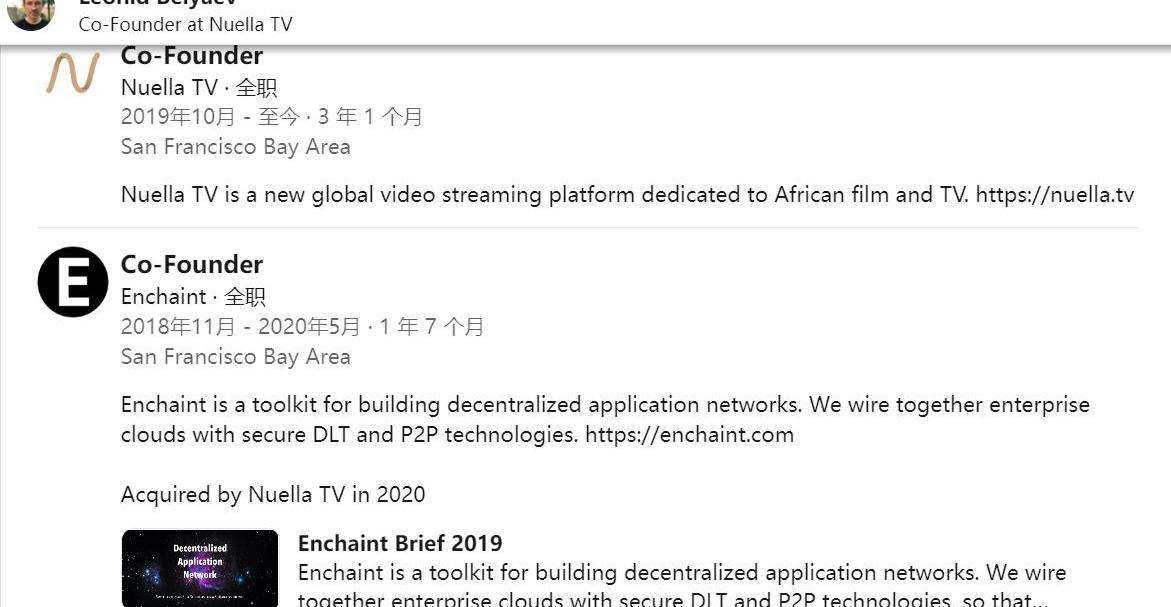 2018年3月成立JustUS,獨立電影業的基于區塊鏈的去中心化基金會。創建由區塊鏈驅動的全球經濟社區,開始著手建設電影領域新生態系統的基礎設施。從目前了解的信息來看,JustUs項目應該是失敗了。2018年11月,成立Enchaint,是一個用于構建去中心化應用網絡的工具包。將企業云與安全的DLT和P2P技術連接在一起,以便公司可以將合同作為應用程序運行、信任他們的數據并提高業務速度。2020年Enchaint被NuellaTV收購,實質就是把這塊的業務整合進NuellaTV。Leonid是NuellaTV的聯創,NuellaTV是一家針對非洲市場的流媒體公司。從LeonidBelyaev的兩次加密領域創業來看,JustUs規劃的愿景太大了,可能最終沒有Hold住而導致項目失敗。而Enchaint的技術又過于單一,只能解決一個點上的問題,無法對整個生態產生改變。至于LeonidBelyaev這次參與XEN項目,可能一是源于對加密的執著,二是經過兩次加密創業嘗試以后,對加密領域深度思考的又一次嘗試。另外,SofaDAO發現兩人都是在俄羅斯生活很多年后移民到了美國創業,背景很相似,也許也是雙方投緣的另外一個小原因吧。至于最真實的原因我們還是等待Jack和Leonid來逐步解鎖吧。NicholasPettas
