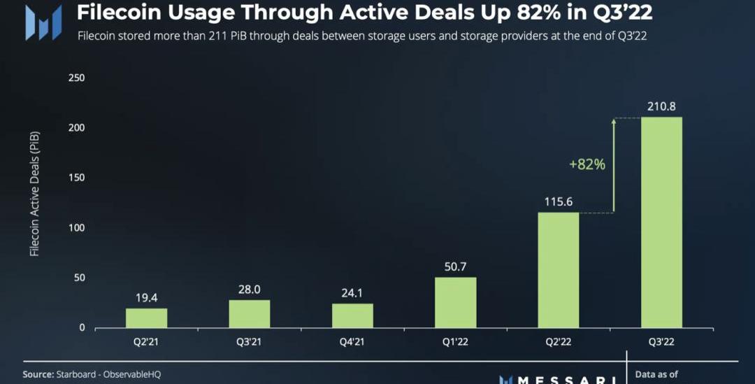 截至22年第三季度末,通過活躍交易將近211個PiB存儲在Filecoin網絡上——與上一季度相比增加了82%。這種積極的增長趨勢自21年第四季度以來一直在持續。