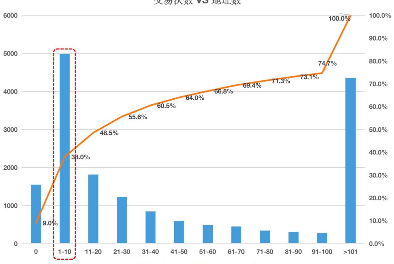 為了進一步論證跨鏈橋的地址低質量的結論,我們對在ETH鏈上有交易的地址進行交易數分析。從下圖所示,有45%的用戶從未有過交易,即使在ETH上有交易的用戶,有超過一半參與跨鏈橋的用戶交易次數都在10筆交易以內。