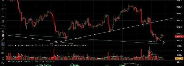 昨日文中給出的空單凌晨到達進場位置,高位觸及1475一線隨后承壓回落,連陰下行跌至1446一線,恭喜跟上的幣友小幅獲利20美刀,沒出的可以先止盈,四小時級別k線走出三連陽但未能突破上方壓力,macd多頭逐步放量雙線金叉運行但延續上行的力度不大,目前行情受ma7?ma14支撐若能破位幣價有再次下行的可能,日線級別形成雙底結構但反彈力度不夠,整體走勢未曾改變,多頭未走出延續,ma7下穿多根均線形成死叉,macd依舊空頭死叉運行,后市思路最安全的做法還是反彈高空,日內思路建議先多后空1445-1420多目標1475-1500,1480-1520空,目標1450-1400破位持有
