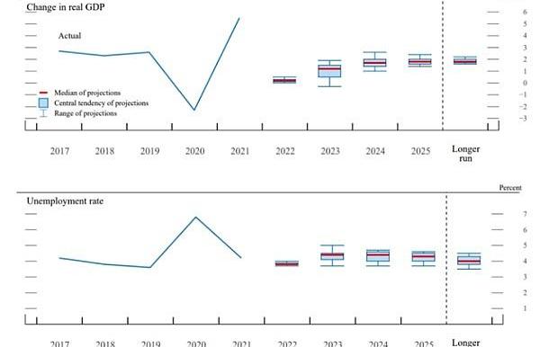 因為這就意味著美聯儲的并沒有就目前的通脹情況而選擇一味的加息,甚至從鮑威爾的這段時間講話中還是透露出一些安撫市場的鴿派發言,所以風險市場的積極性開始調動,但是緊接著在解讀經濟衰退和失業問題的情況時,市場的樂觀性開始消失,尤其是失業率已經從預期中的上限4%上調到了2023年的上限5%。
