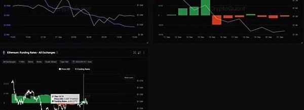 今天是出現了凈流入,雖然這個數值不是太大,比特幣在所有交易所的存量這兩天都是維持著一個比較低的水平,但是cdd指標最近是出現了兩次比較大幅度的警報,這個數值都是超過了2.4個medium,甚至在9月20號的時候,還曾經出現過一次4.8million以上的Cdd的警報,它代表的就是這些遠古的比特幣持有者,也就是我們所謂的老韭菜,老前輩們,他們有些人已經是開始在拋售手中的比特幣,資金費率目前也是空頭開始占據了優勢。