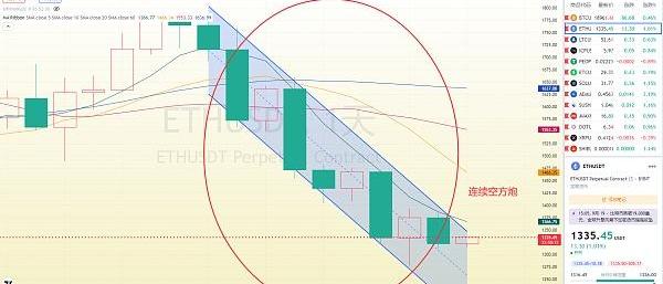 ETH從4小時圖看,行情沿著下行通道運行,通道上沿附近是做空的最佳進場位置。加之均線的方向性指引,目前思路很明顯,就是反彈做空。