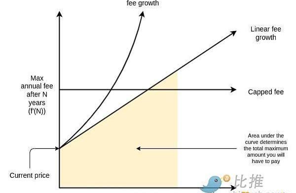 超線性的f(N)值隨著時間推移而增加的最大年費是一個好主意。首先,為長期安全支付更多費用是整個經濟的普遍特征。固定利率抵押貸款的利率通常比可變利率抵押貸款高。你可以通過提供長期鎖定的存款來獲得更高的利息。這是銀行支付給你的補償,因為你為銀行提供了長期的安全保障。同樣,較長期的政府債券通常收益率更高。第二,年費應該能夠最終根據域名的市場價值進行調整,我們只是不希望它發生得太快。