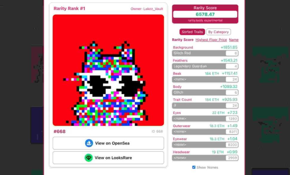 NFT的稀有性對收藏者來說非常重要,市場上有多種方法跟工具可用于確定單個NFT的整體稀有度,其中一些包括Rarity.Tools、RaritySniper、Traitsniper和RaritySniffer,每個都可以提供數千個NFT藏品的大量稀有度和價格數據。例如下圖為用Rarity.tools追蹤最稀有MoonbirdNFT的數據。
