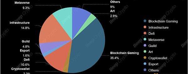 前一段時間,根據AnimocaBrands公布的2021年最后3個月至2022年前4個月未經審計的主要財務和業務報告數據顯示,AnimocaBrands投資項目340余項,總投資金額達15億美金。投資項目主要涉及區塊鏈游戲、電子競技、公會、元宇宙、藝術、市集、去中心化金融、基礎設施、加密錢包等類型。這個報告不完全統計了2017年6月30日至2022年6月30日之間,AnimocaBrands投資的312個項目。數據顯示,AnimocaBrands投資領域前三的是區塊鏈游戲、基礎設施、去中心化金融,投資數量分別占總投資的35.4%、14.8%、10.6%。