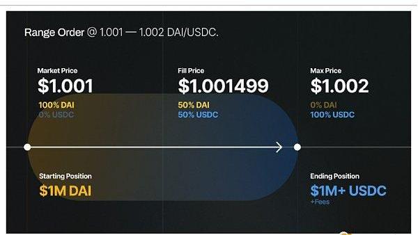 另外,UniswapV3還新增了范圍訂單功能,類似于CEX的限價掛單。當DAI的市場價格低于1.001USDC時,LP可將1000萬美元DAI添加到1.001-1.002DAI/USDC范圍內;當交易價格高于1.002DAI/USDC時,LP的流動性將完全轉換為USDC;而當DAI/USDC再次低于1.002時,LP必須提取其流動性以避免自動轉換回DAI。