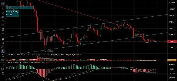 大餅整體走勢呈下行,昨日周末行情波動較小,凌晨選擇下行但未曾破位,跌至19650附近支撐反彈,目前幣價在19800附近震蕩,四小時級別布林帶三線走平中軌下移,行情四次觸及下方支撐線都未跌破,可見力度較強,雖走出反彈但力度不大,短期行情仍是震蕩,若破位預計力度不會太小,日線級別行情如思路一致走出連陰下挫,裸k來看空頭占優,下方支撐在逐步抬高,空頭縮量雙線處于低位,預計日內還是震蕩,耐心等待周一行情波動破位可追,思路建議反彈高空為主低多為輔,上方壓力20100-20500,下方支撐19500-19000