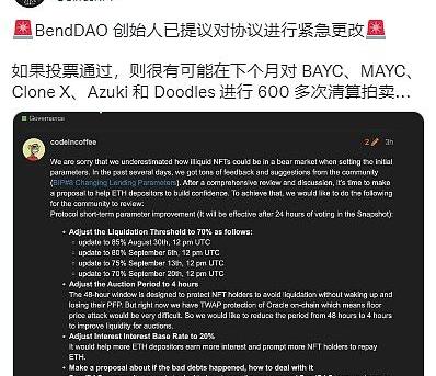 8月23日,BendDAO通過了緊急參數更新提案,將清算門檻從95%逐步降低到截至9月20日的70%。此外,DAO還同意將競標鎖定期從48小時縮短至4小時。?