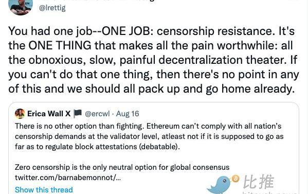 前以太坊核心開發人員LaneRettig在推特上表示,“你只有一份工作:抗審查。如果你不能做這一件事,那么這一切都沒有意義,我們都應該收拾行李回家了。”