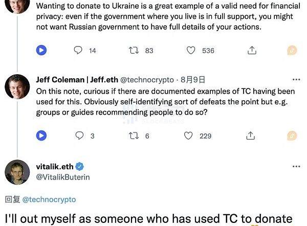 而對普通的加密用戶也同樣如此,當我們遇到要向特定組織和國家匿名捐款,或支付敏感的醫療費用等情況時,隱私工具就體現出了它的價值,只不過是此類情況并不常見罷了。9日,Vitalik為了支持這一觀點,還在Twitter上公開聲明自己曾使用TornadoCash向烏克蘭捐款。