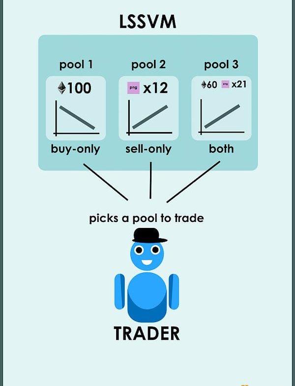 sudoswap最新推出的sudoAMM其實也是0xmons一開始就設想好的NFTAMM協議和sudoswap的重大升級。LSSVM原型由許多單獨的NFT池組成,每個池由一個流動性提供者管理,并由自定義聯合曲線參數化,然后交易者可以在一個NFT池中或者跨多個池進行交易。
