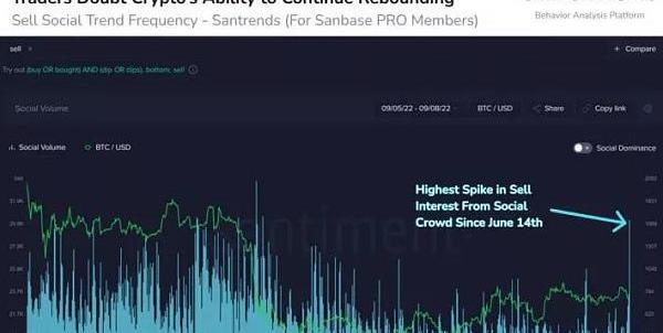 Santiment的最新分析之一也支持這一點。報告顯示,Twitter、Reddit和Discord等社交媒體平臺上的“賣出”提及次數已達到2個月以來的最高點。根據分析平臺,