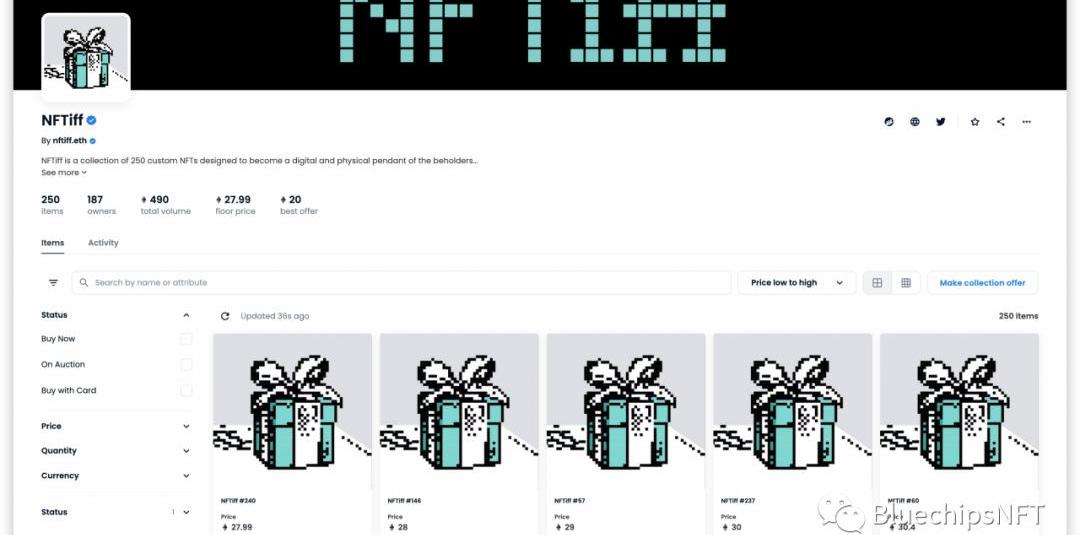 Tiffany:2022年7月31日,蒂芙尼在其社交媒體上發布了一則像素風格的宣傳視頻,宣布將于8月5日正式上線旗下NFT。蒂芙尼將“NFT”與“Tiffany”雙名詞提取組合,為旗下首套NFT命名“NFTiffs”。NFTiffs”系列限量250個,每個售價30枚以太坊,目前市價約55000美元,只有擁有CryptoPunks系列的NFT擁有者才有資格購買。