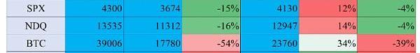 這三個月基本上就是兩大趨勢,5月加息后,市場認為加息符合預期,因利空兌現而上漲,這是近三個月的市場高點,當時SPX還在4300點,比特幣還有39000美元,以太坊還接近3000美元。隨后市場就教育了這些把利空兌現當利好的投資者,一路下跌,一直跌到了6月中旬達到了階段低點