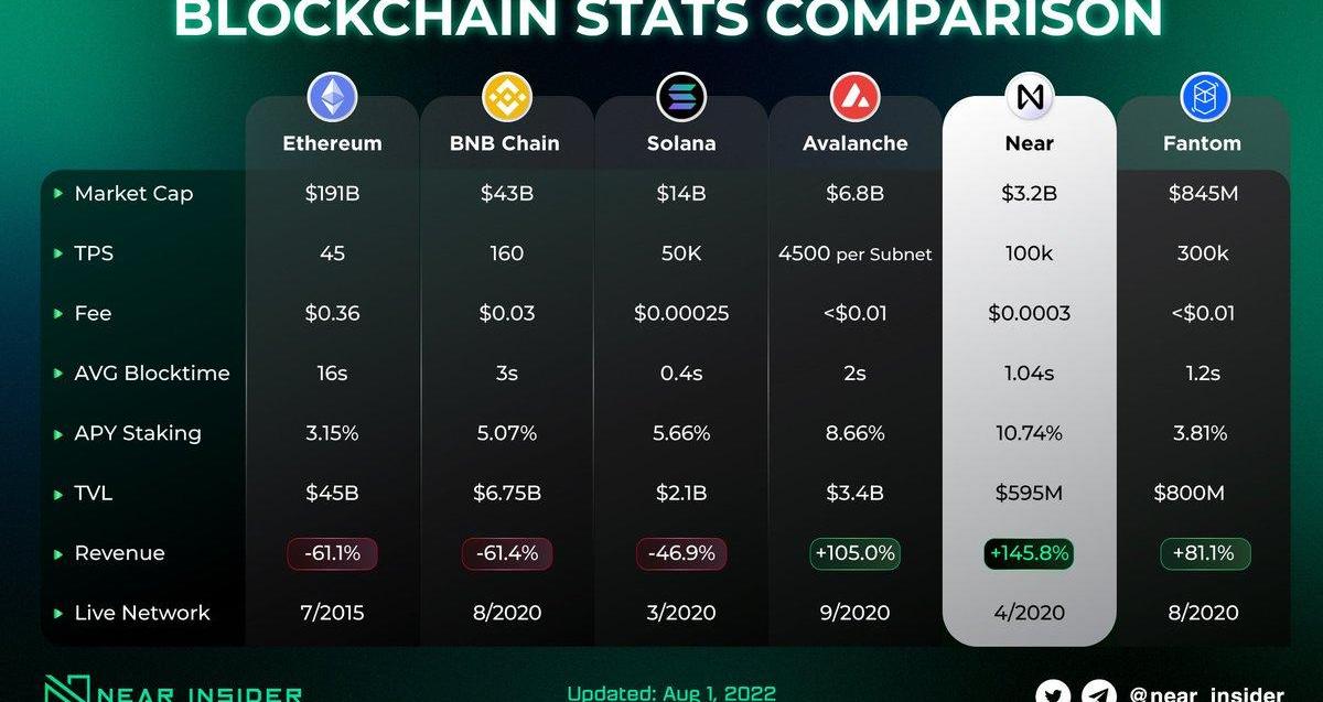 簡單來說,盡管今年前6個月市場波動較大,但NEAR的利潤仍高于其他區塊鏈,增長超過145%。下圖是NEAR與其他區塊鏈指標的比較。