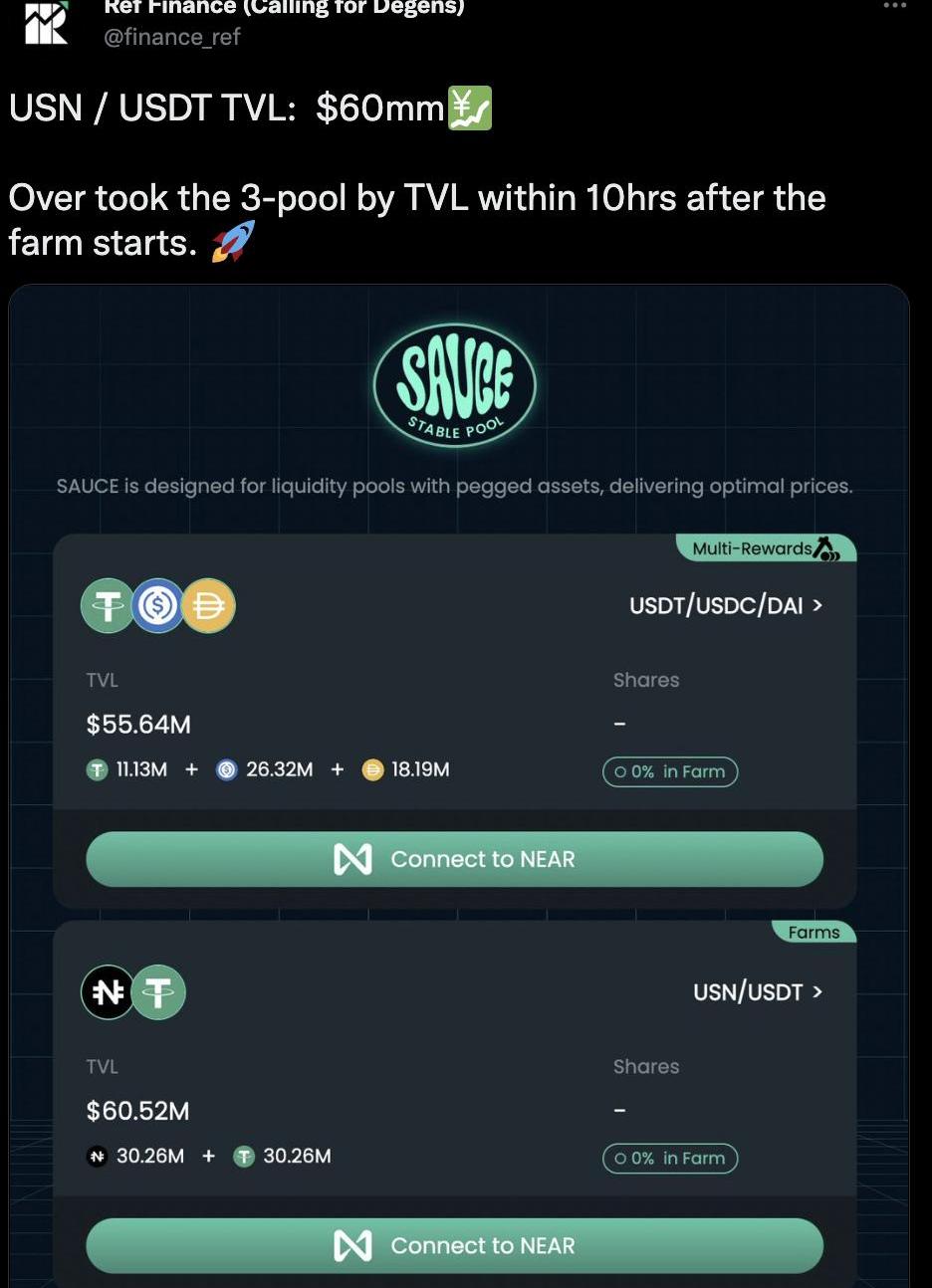 隨著USN的發布,REF在發布后的10小時內就吸引了6000萬美元以上的TVL。